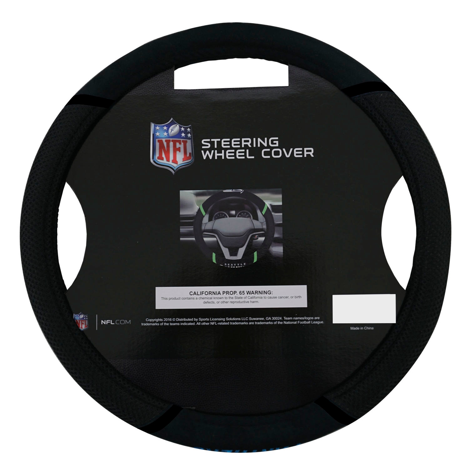 The steering wheel cover is decorated with your favorite football team's logo.